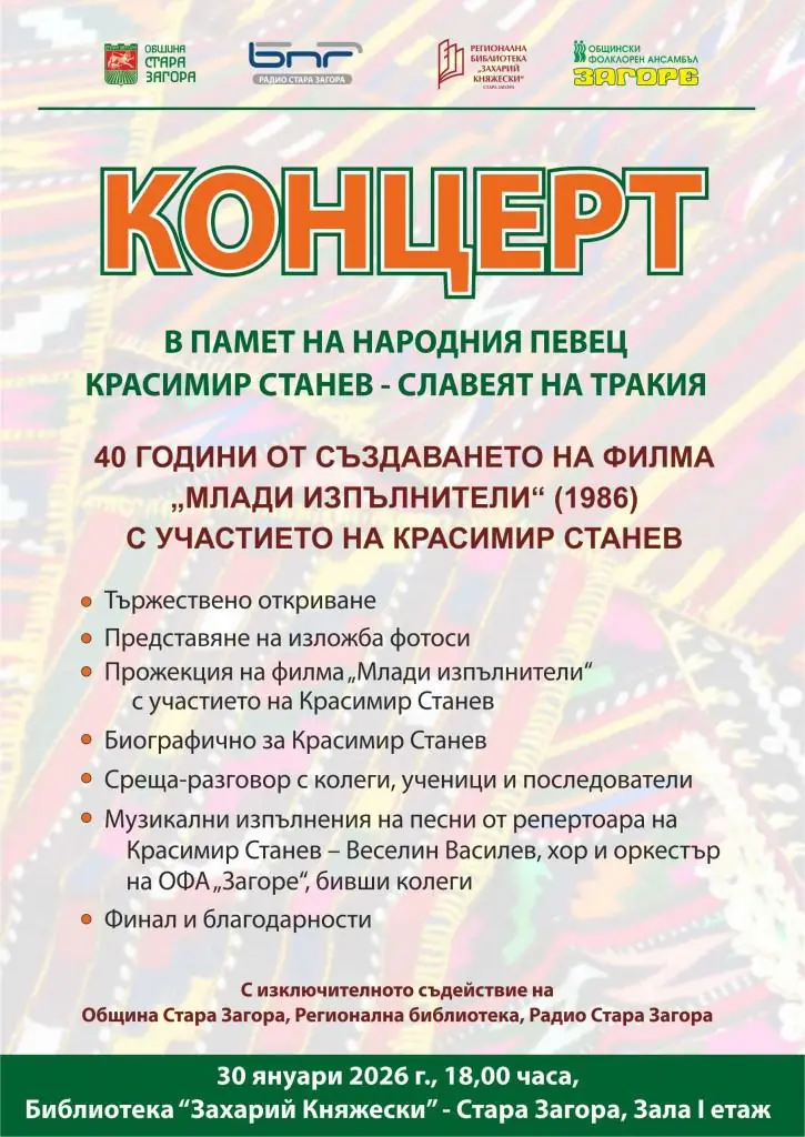 Общинският фолклорен ансамбъл „Загоре“ отбелязва 40 години от създаването на филма „Млади изпълнители“ от 1986 г. с участието на Красимир Станев
