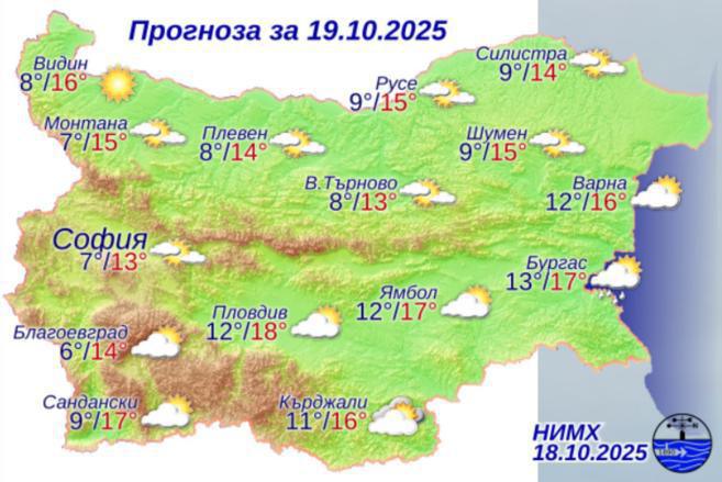 Днес над по-голямата част от страната ще бъде слънчево. Преди обяд над южните и източните райони облачността все още ще бъде значителна, но ще е почти без валежи. Вятърът ще бъде умерен, в Дунавската равнина временно силен от запад-северозапад. Максималните температури ще бъдат между 13° и 18°, в София – около 13°.