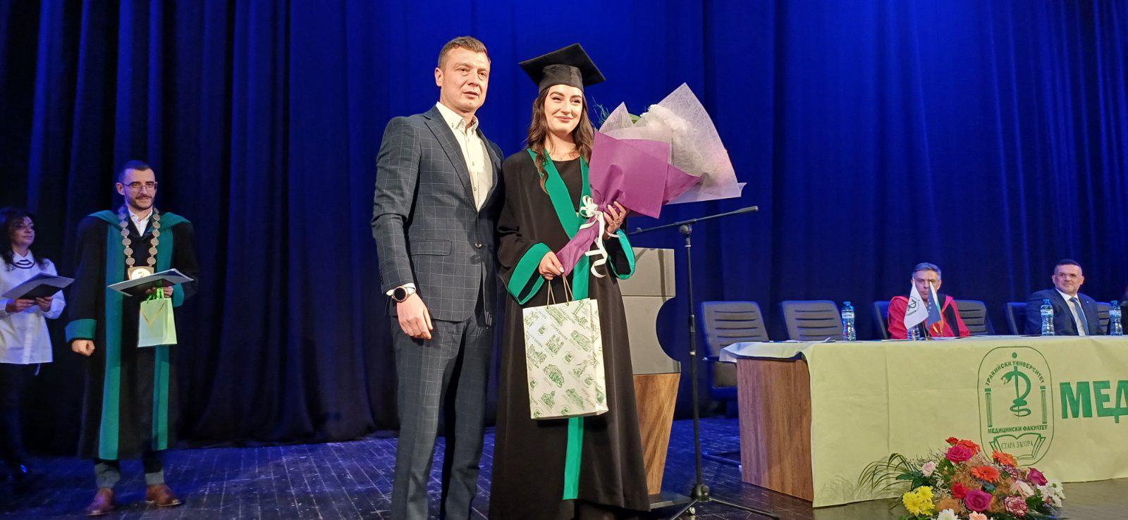 Официален гост на церемонията беше заместник-кметът на Община Стара Загора с ресор „Финанси, бюджет и икономика“ Светослав Колев, който връчи дипломата на отличничката на випуска – д-р Ралица Дочева.