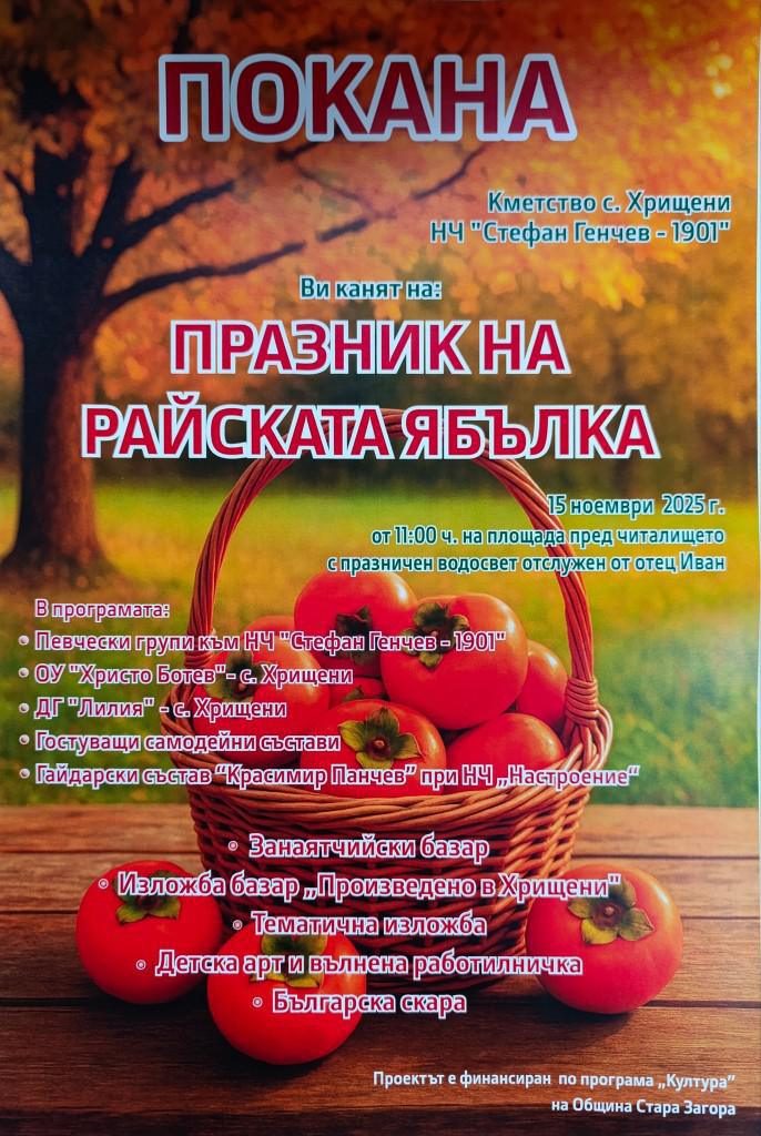 Цял ден, изпълнен с музика и танци ще зарадва жителите и гостите на село Хрищени. Празникът на райската ябълка ще се проведе тази събота (15 ноември 2025 г.) на площада пред НЧ „Стефан Генчев – 1901 г.“.