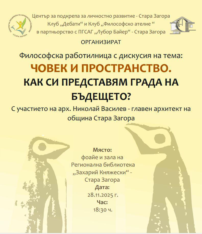 Клуб „Дебати“ и клуб „Философско ателие“ към Център за подкрепа за личностно развитие – Стара Загора, в партньорство с ПГСАГ „Лубор Байер“, организират философска работилница с дискусия на тема „Човек и пространство. Как си представям града на бъдещето?“. Работилницата ще се проведе в Регионална библиотека „Захарий Княжески“ на 28 ноември 2025 г. от 18.30 ч.