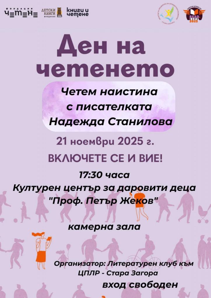 Литературният клуб към Центъра за подкрепа за личностно развитие – Стара Загора организира тематичната среща „Четем наистина с писателката Надежда Станилова“. Срещата ще се проведе на 21 ноември 2025 г. от 17.30 ч. в камерната зала на Културния център за даровити деца „Проф. Петър Жеков“, ул. „Митрополит Методий Кусев“ №20, с вход свободен.