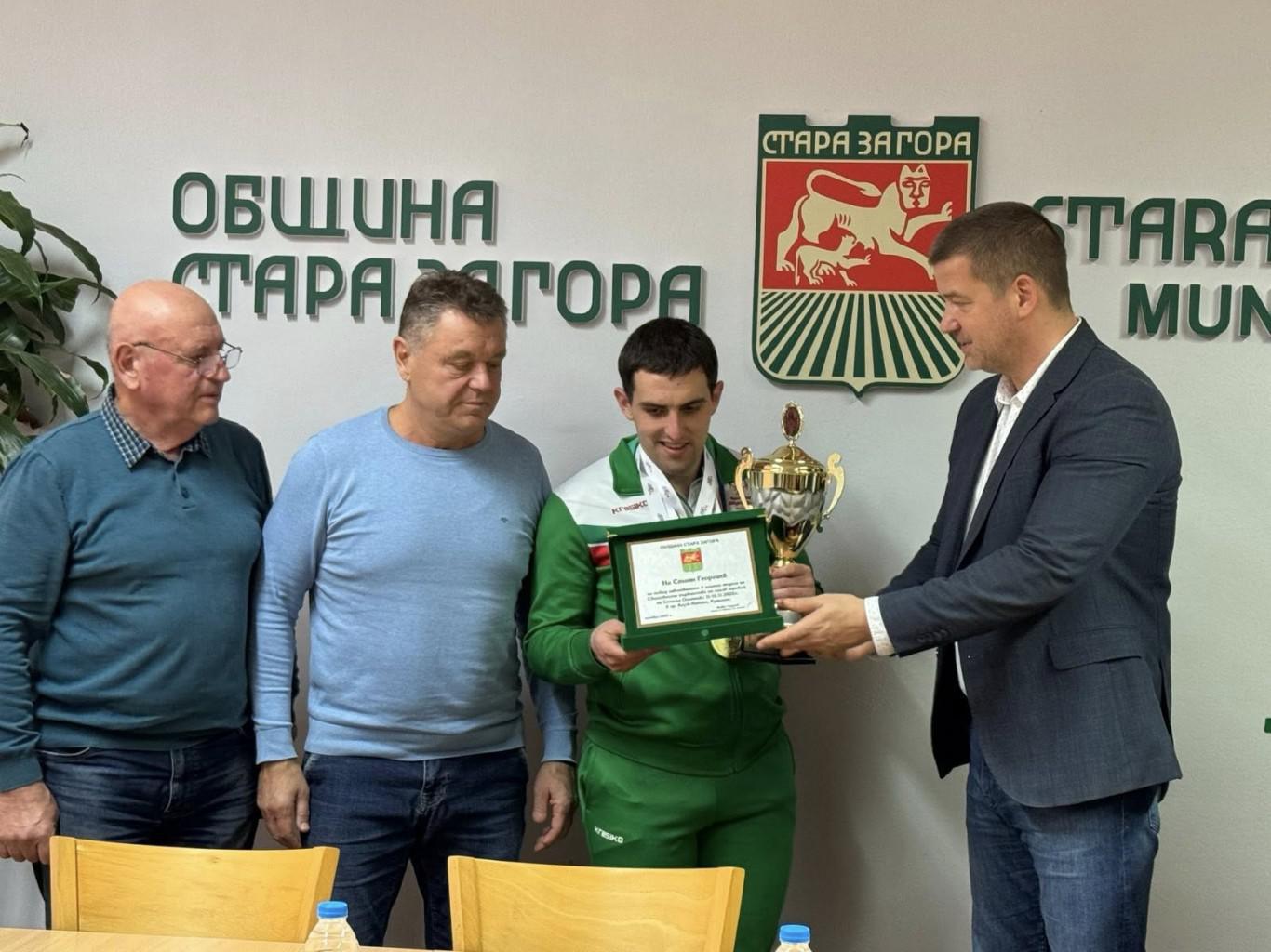 Кметът Живко Тодоров удостои с плакети световния шампион по силов трибой Стоян Георгиев и неговия треньор Евгени Танев. Отличието бе връчено по повод четирите златни медала, които младият спортист завоюва на Световното първенство в румънския град Клуж-Напока. В зала 203 на Община Стара Загора присъстваха треньори, спортни специалисти и представители на местните медии. Сред гостите бяха началникът на отдел „Спортни дейности“ Петко Крумов, треньорите Евгени Танев и Стоян Стоянов (дядо на състезателя).