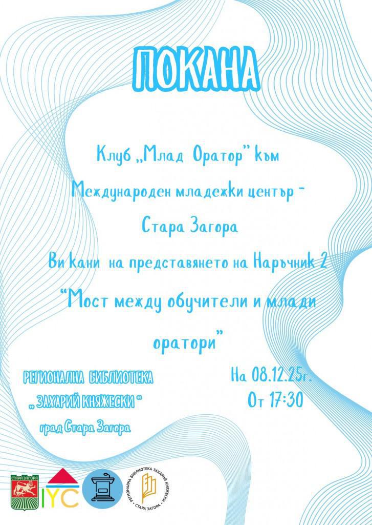На 8 декември 2025 г. (понеделник) от 17:30 ч. в залата на Регионална библиотека „Захарий Княжески“ ще бъде представен новият „Наръчник за бъдещи презентатори 2 – Мост между обучители и млади оратори“.