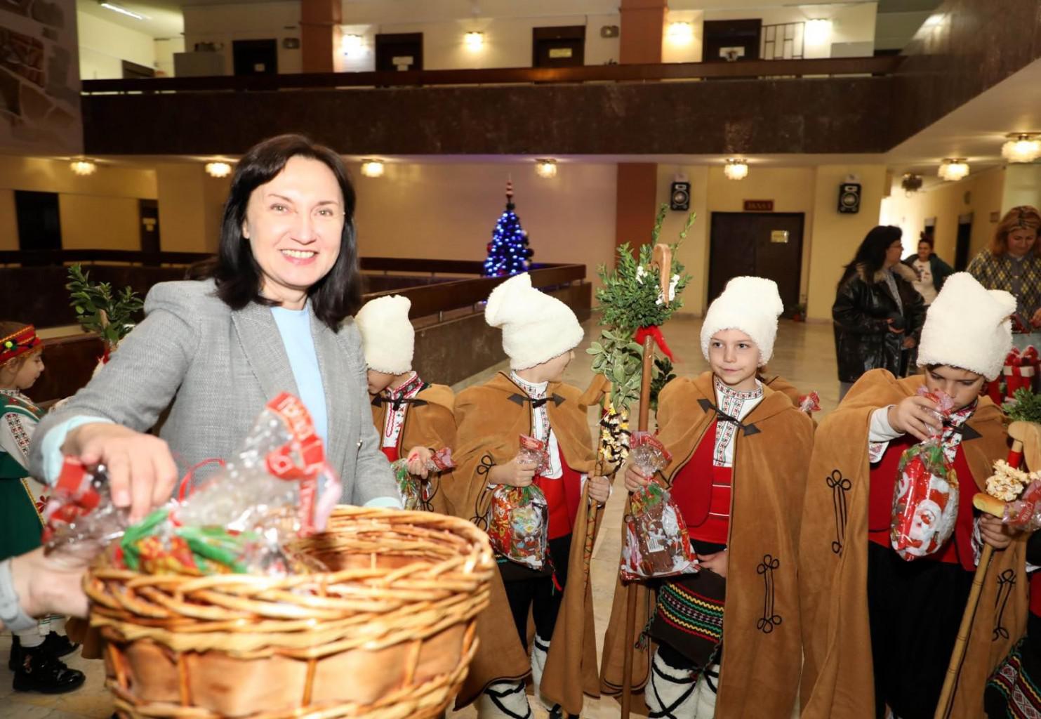 Коледни песни, танци и наричания изпълниха сградата на Община Стара Загора с духа на българската традиция. Фоайето на администрацията се превърна в празничен дом, след като малки старозагорски коледари донесоха благословии за здраве, благодат и благополучие.