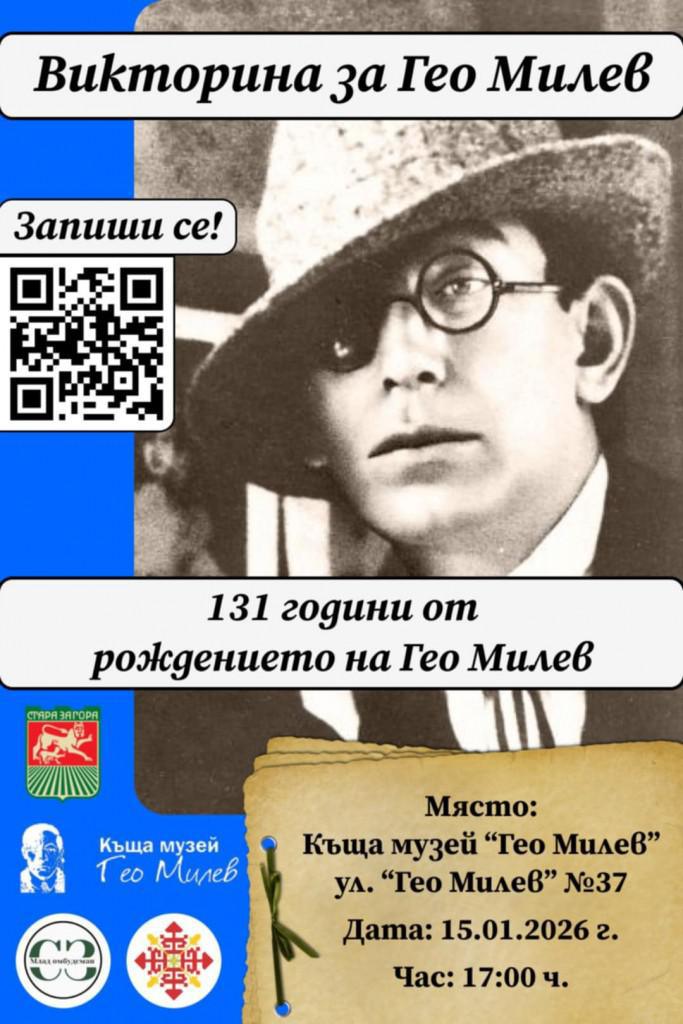 За втора поредна година Къща музей „Гео Милев“ и Младите омбудсмани на Стара Загора, Илиян Илиев и Зара Кичукова, с активното участие на Адриан Георгиев, дванадесетокласник от ППМГ „Гео Милев“ и млад омбудсман за 2025 г., в партньорство с Община Стара Загора, организират литературна викторина, посветена на 131 години от рождението на Гео Милев, български поет и публицист и един от най ярките представители на експресионизма в българската литература.