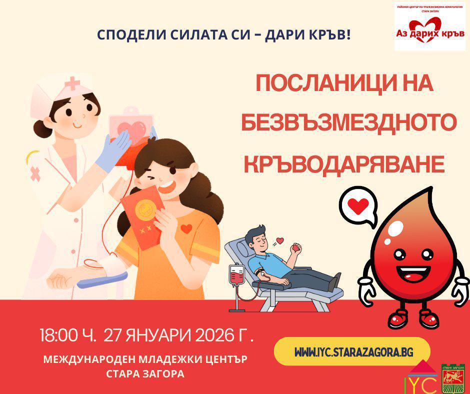 В Международен младежки център - Стара Загора на 27 януари от 18.00 ч. ще се проведе обучение за Посланици на безвъзмездното кръводаряване, насочено към млади хора, готови да бъдат глас на една от най-хуманните каузи - спасяването на човешки живот.