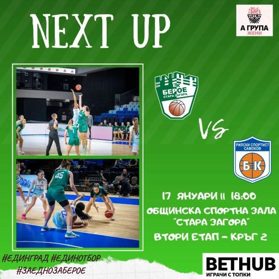 На 17 януари 2026 г. (събота) от 18.00 ч. в спортна зала „Стара Загора“ ще се проведе баскетболна среща от А група - жени, втори етап, кръг 2 между отборите на БК „Берое“ и БК „Рилски спортист“ (Самоков).
