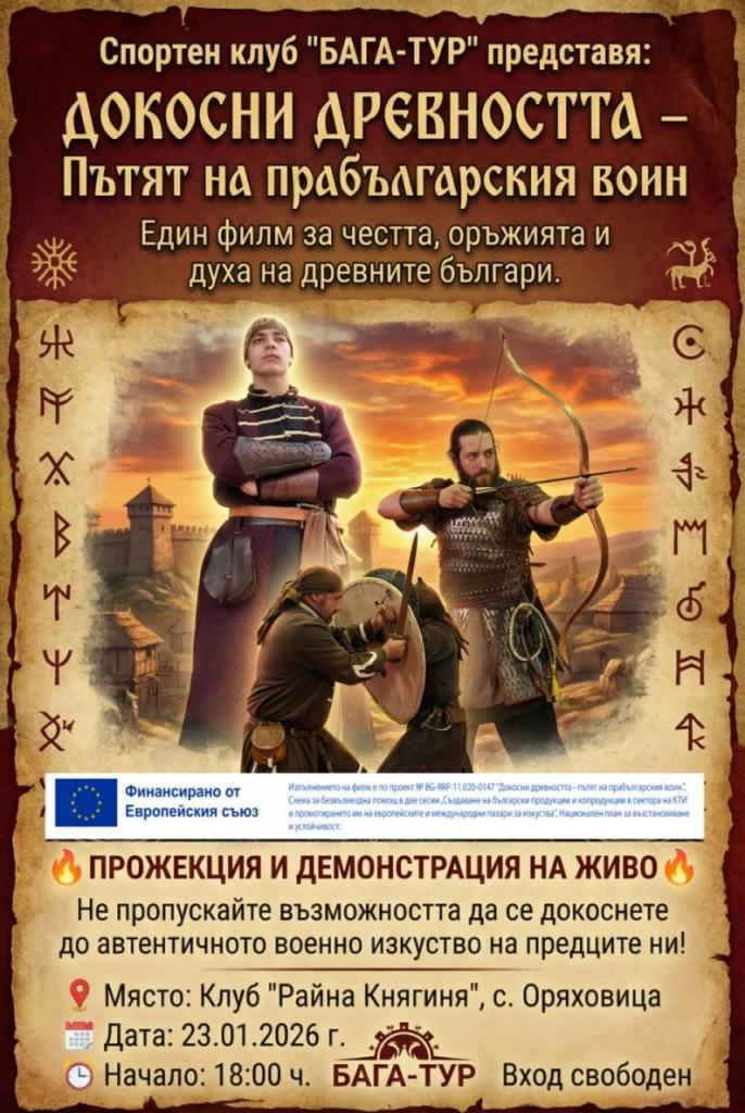 Спортен клуб „Бага-тур“ ще представи филма „Докосни древността – пътят на прабългарския воин“ на 23 януари 2026 г. в Клуб „Райна Княгиня“, с. Оряховица.