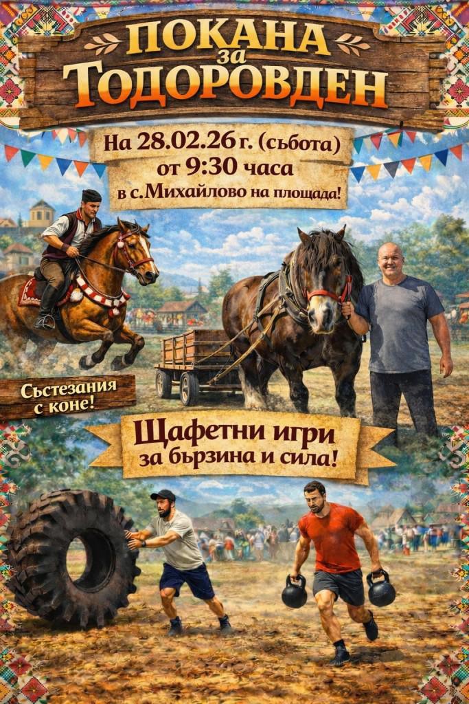 Старозагорското село Михайлово ще отпразнува традиционно Тодоровден с конни състезания и щафетни игри. Празникът ще започне на 28 февруари 2026 г. (събота) от 9.30 часа на площада в селото.