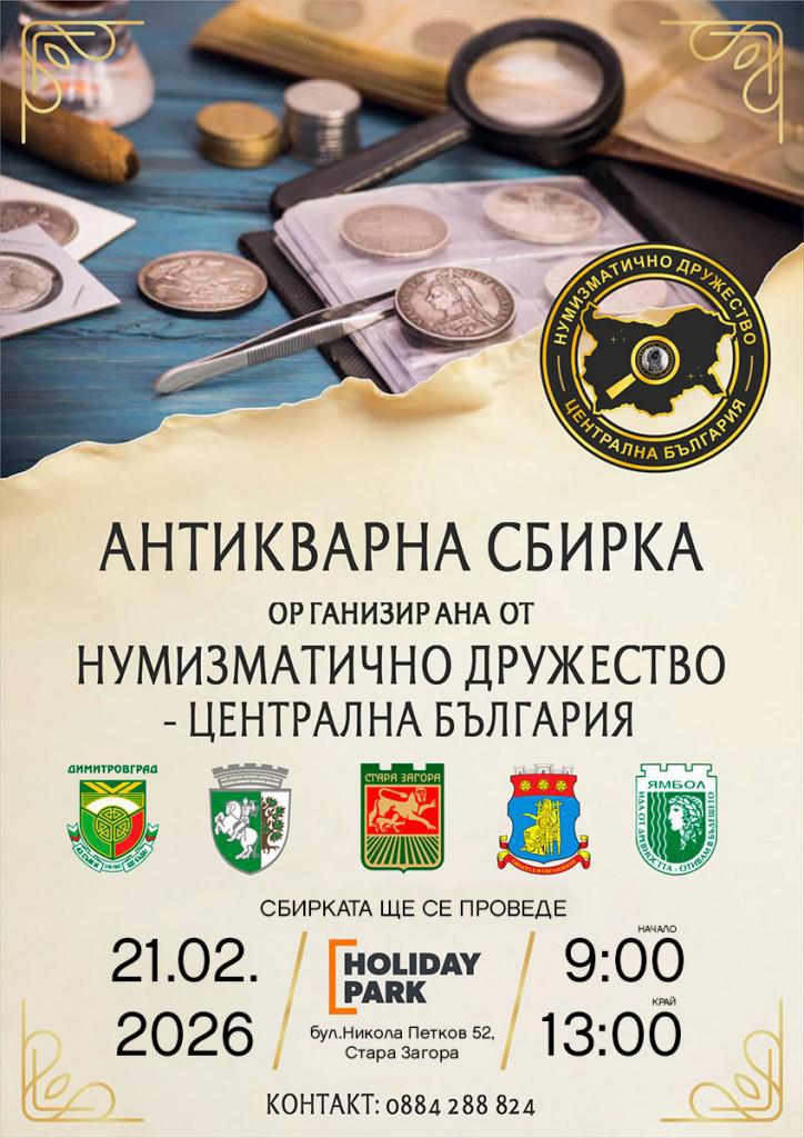 Нумизматично дружество - Централна България организира Антикварна сбирка в Стара Загора на 21 февруари 2026 г. от 09.00 ч.