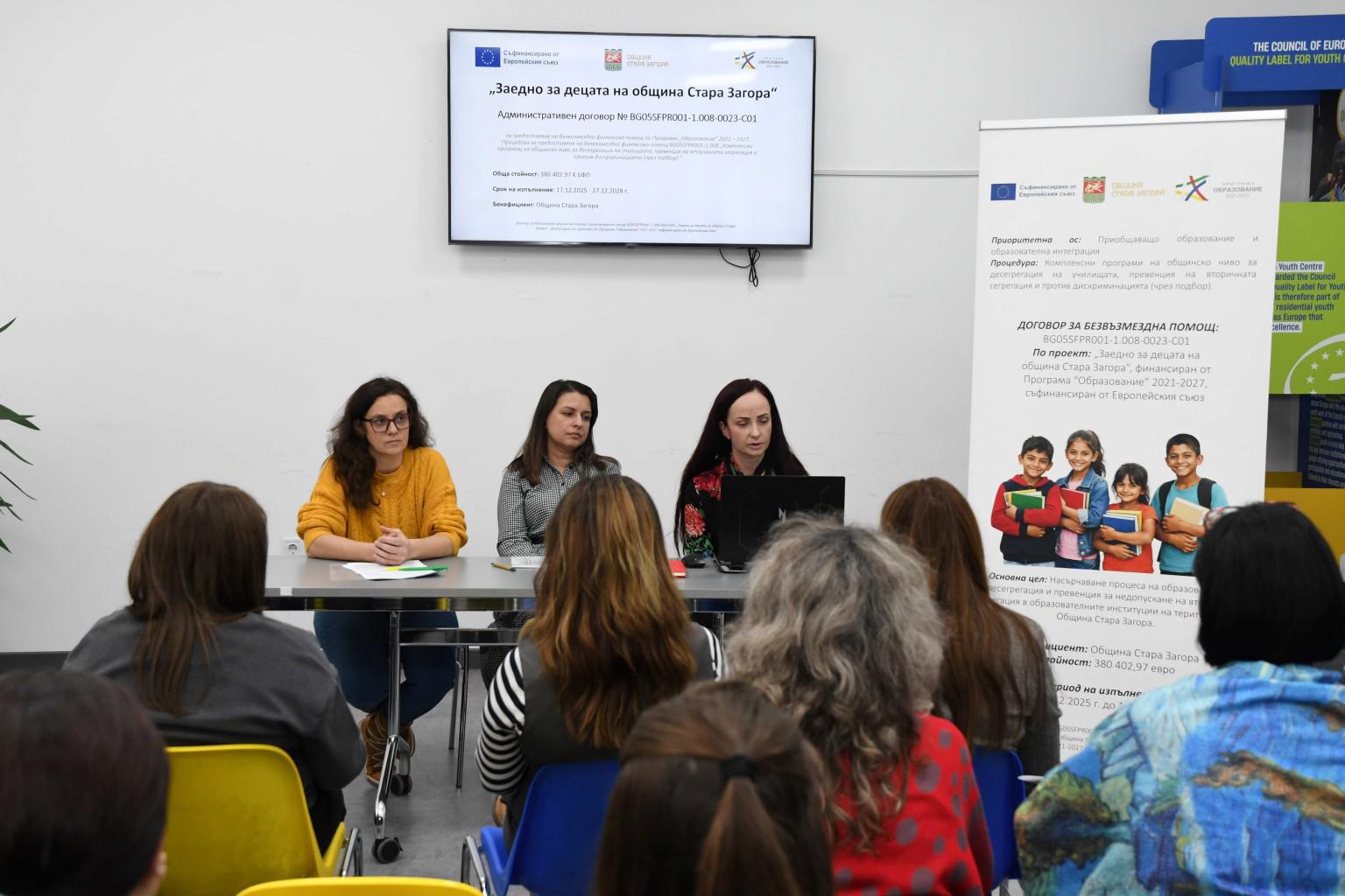 В Международния младежки център - Стара Загора се проведе откриващата пресконференция по проект „Заедно за децата на община Стара Загора“, реализиран по Програма „Образование“ 2021- 2027, съфинансиран от Европейския съюз.