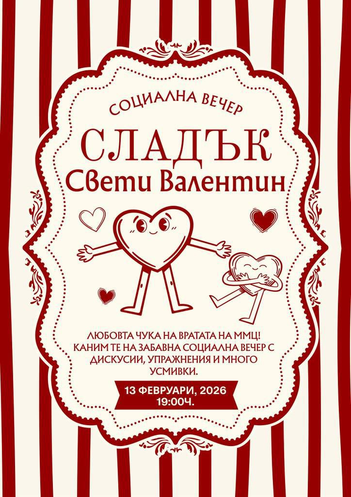 Международен младежки център - Стара Загора кани млади хора на уютна и забавна социална вечер, посветена на празника на любовта - „Сладък Свети Валентин“. Инициативата цели да насърчи общуването, споделените емоции и доброто настроение в неформална и приятелска атмосфера.