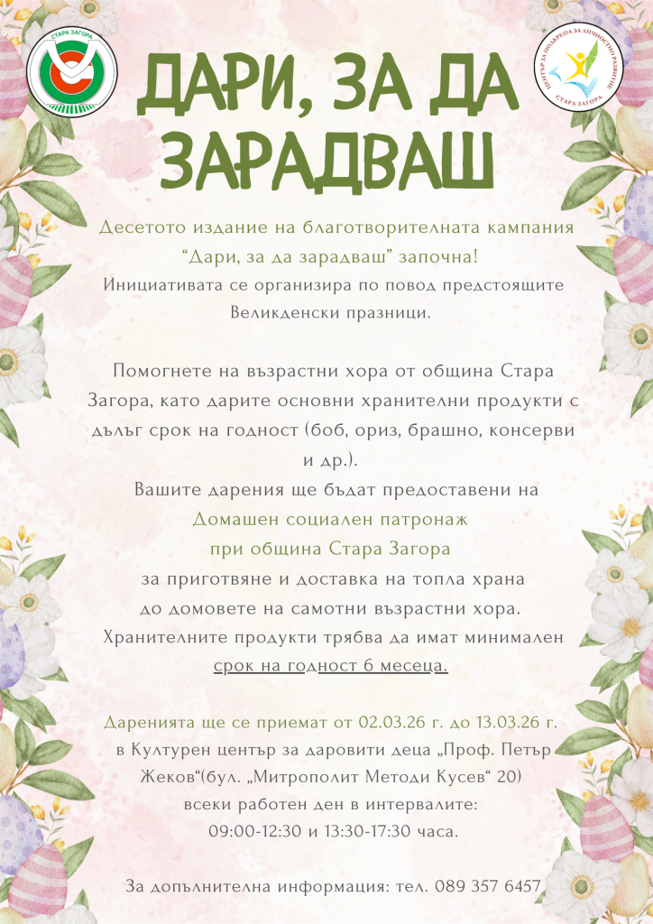 Младежкият общински съвет - Стара Загора стартира великденското юбилейно 10-о издание на благотворителната кампания „Дари, за да зарадваш“. Инициативата се реализира в навечерието на великденските празници и е насочена към подкрепа на възрастни хора и лица в уязвимо положение на територията на общината.