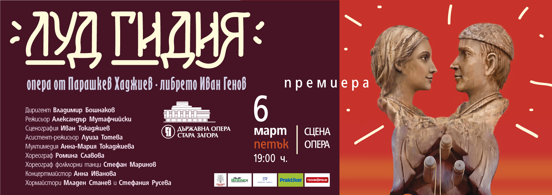 В премиерния спектакъл на 6 март в ролята на Радан, чорбаджия е Ивайло Джуров, Раданица, негова жена - Тереза Бракалова, Зорница, дъщеря на Радан - Таня Лазарова, Илия (Луд гидия), ратай; любим на Зорница - Николай Моцов, Мечо, ратай; приятел на Илия - Теодор Петков, Куна, ратайкиня; любима на Мечо - Елена Петрова, Поп Матей - Мартин Димитриевски, Бей Осман - Валери Турманов, Кадия - Марин Русинов, първи чорбаджия - Костадин Якшев, втори чорбаджия - Любомир Петков, тъпанджия - Милен Денев. Участват още оркестър, хор на Държавна опера-Стара Загора, Общински фолклорен ансамбъл „Загоре“.