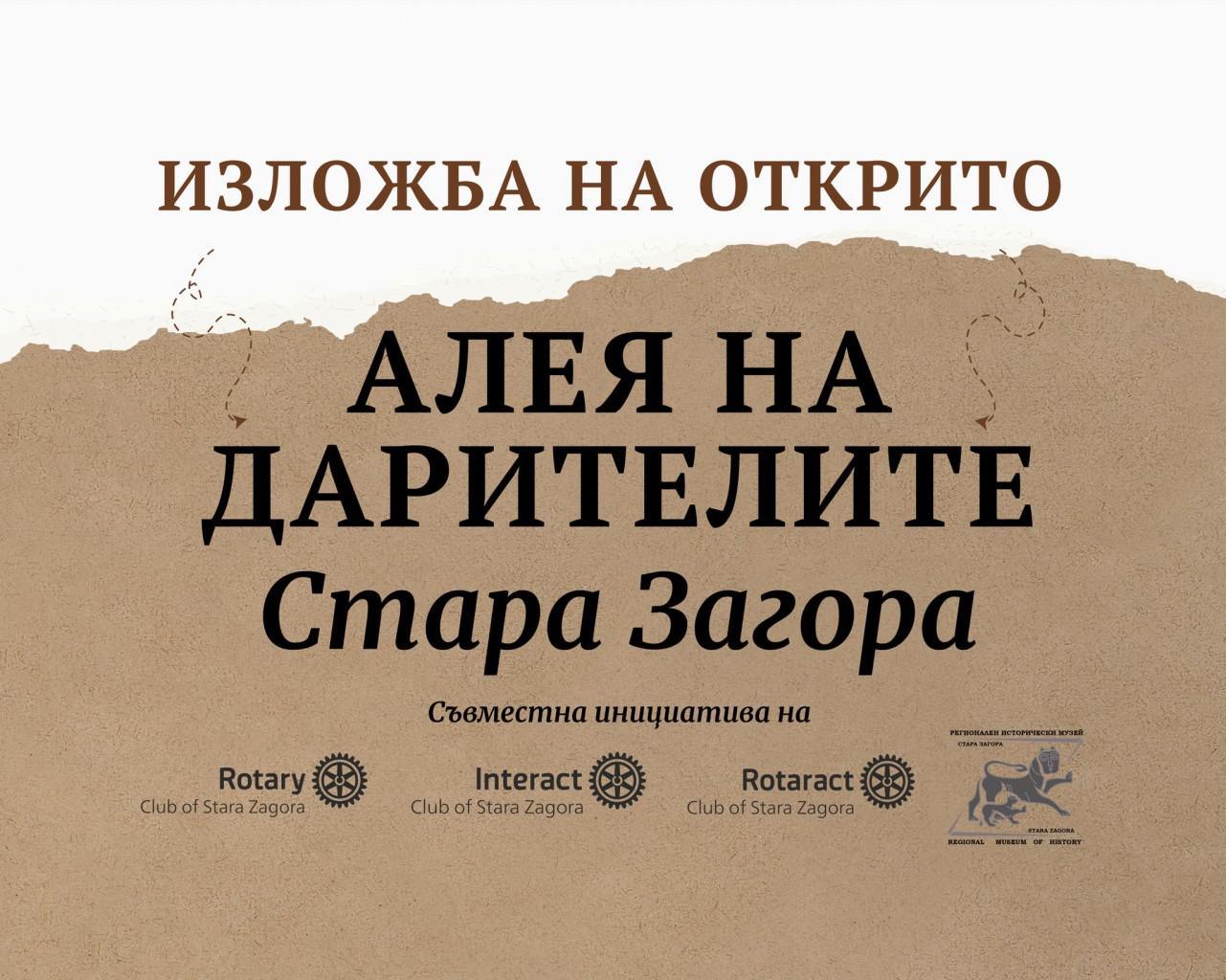 Днес  беше открита изложбата на открито „Алея на дарителите – Стара Загора“. Инициативата е на Ротари клуб Стара Загора с президент Боян Славов, съвместно с младежките организации Ротаракт и Интеракт, и се реализира с подкрепата на Регионалния исторически музей – Стара Загора. Експозицията разгледа с възхищение и  зам.-кметът на Община Стара Загора Светослав Колев.