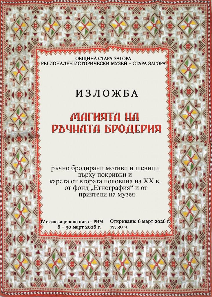 В навечерието на Международния ден на жената, на 6 март 2026 г. от 17.30 ч., в Регионален исторически музей – Стара Загора ще бъде открита изложбата „Магията на ръчната бродерия“.