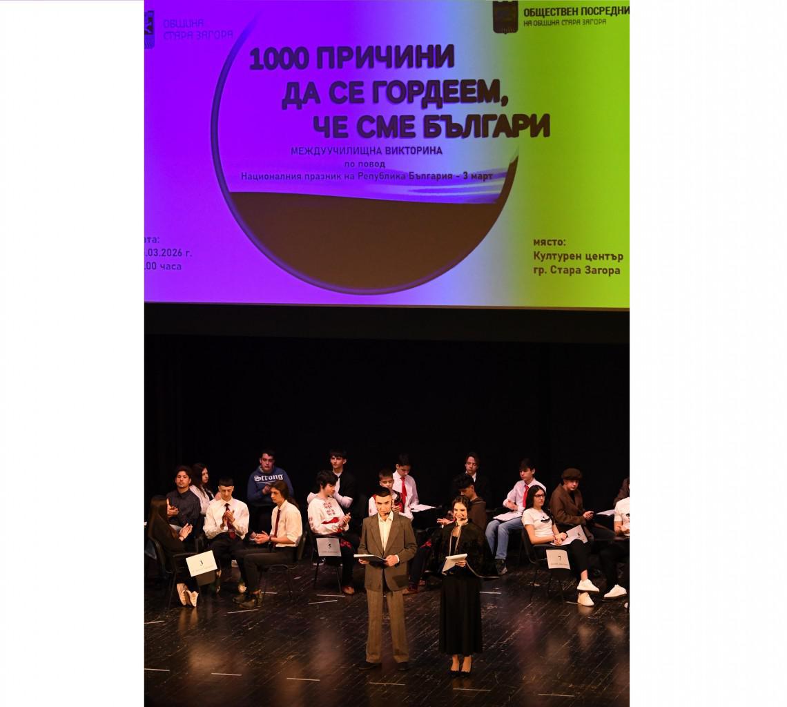 Традиционната междуучилищна викторина „1000 причини да се гордеем, че сме българи“ се проведе вчера в Културен център „Стара Загора“. Събитието се организира ежегодно по повод Националния празник на България – 3 март. Тазгодишното издание се фокусира върху историята и забележителностите на Стара Загора.