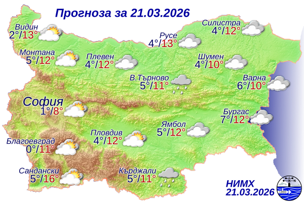 Днес ще бъде предимно облачно с временни разкъсвания на облачността над западните райони. На изолирани места главно около Стара планина, в Родопите и източните райони ще превали дъжд, над 1000 метра – сняг. В Западна България ще духа слаб до умерен вятър от североизток. В източната половина от страната вятърът ще е умерен и силен от север-североизток. Максималните температури ще бъдат предимно между 8° и 13°, в София - около 8°.