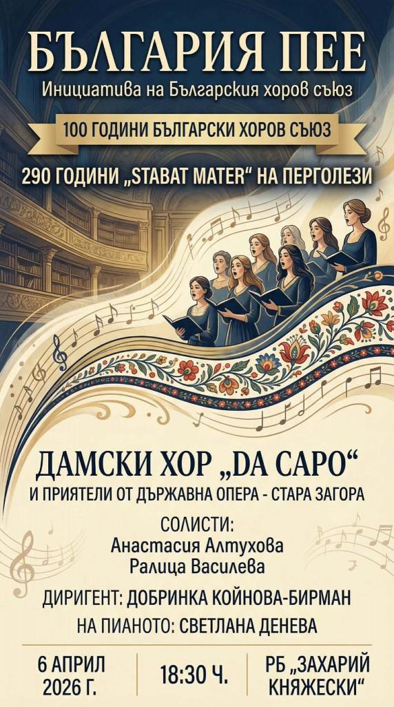 Народно читалище „Родина-1860“, Дамски хор „Da capo“ и приятели от Държавна опера Стара Загора канят на Хоров концерт, който ще се състои на 6 април 2026 г. от 18.30 ч. в залата на Регионална библиотека „Захарий Княжески“.