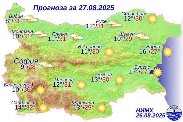 Днес ще бъде слънчево, над западните и северните райони с разкъсана висока облачност. Ще духа слаб до умерен източен вятър. Максималните температури ще бъдат между 27° и 32°, за София - около 28°.