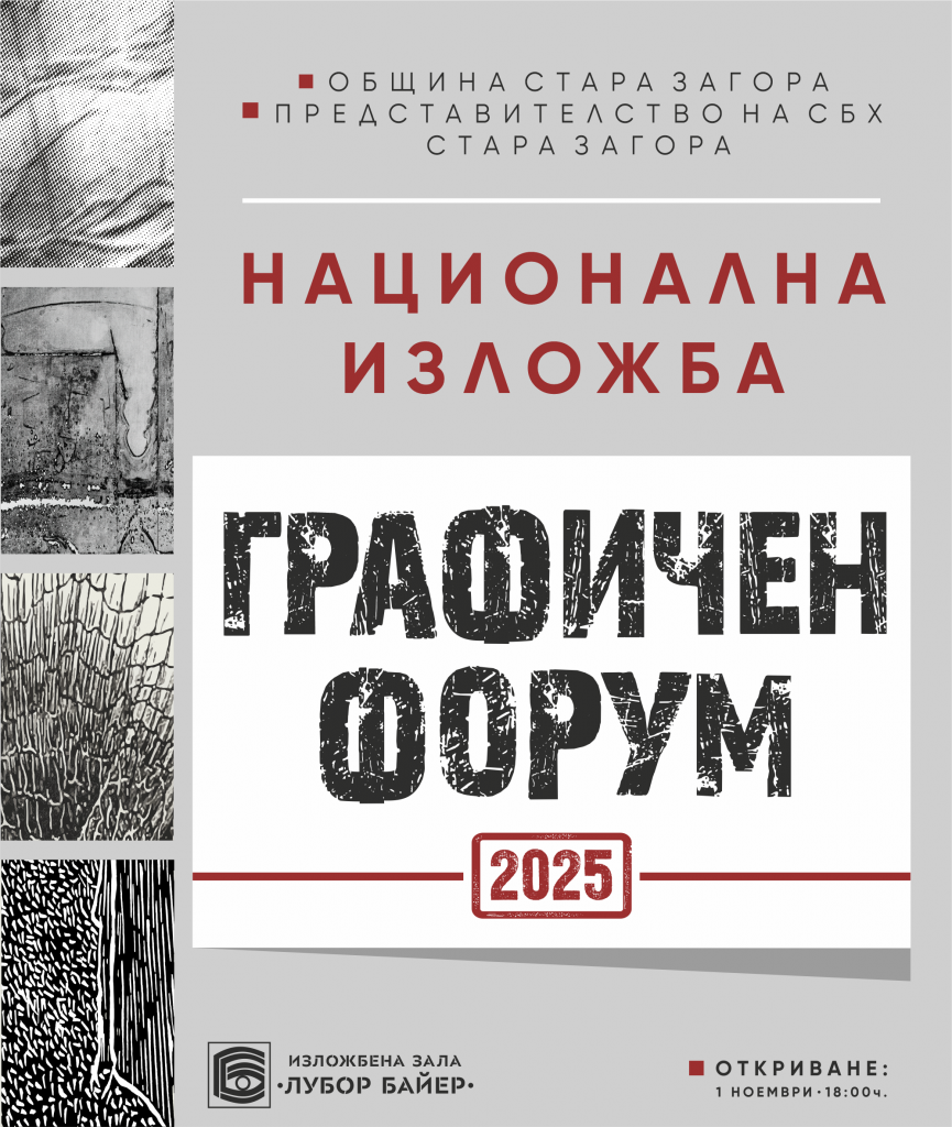 Национална изложба „Графичен форум“ ще бъде открита на 1 ноември 2025 г. от 18.00 ч. в изложбена зала „Лубор Байер“. Събитието се организира за девета поредна година в града с подкрепата на Община Стара Загора.